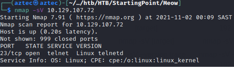 I started off with a nmap scan and the scan gives us a result of telnet port 23/tcp being open: