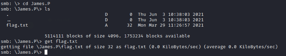 After some digging, in the “James.P” directory I came across the flag and downloaded the file using the “get”: